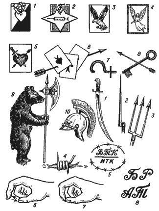 И в заключение еще несколько характерных изображений: 1. Наркоман 2. Наркоманка(буква "F" обозначает - "свободная". 3. Воровской авторитет Накалывают на большом пальце правой руки. 4. Удача в жизни 5. Символ мести, неразделенной любви 6. Символ шулера 7. Знак сбытчика похищенного (уст.). 8. Символ вора-взломщика (уст.). 9. "Медвежатник" - символ лесных ИТУ. 10. Вор Такой же символ может быть нанесен и на палец руки. Значение тождественно.