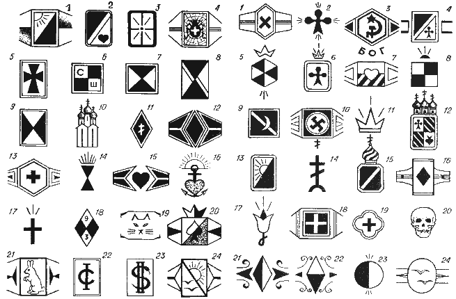 1. "Свети вору, а не прокурору" 2. Был судим по ст. 117 УК РСФСР 3. "Один в кругу друзей" - несовершеннолетним был в местах лишения свободы. 4. "Гоп-стоп" - перстень судимого по ст. 145 УК РСФСР. 5. Воровская масть 6. Два года находился в спецшколе; развратник. 7. Отбывал наказание в "сучьей зоне" 8. Ищу девушку для сексуальной близости 9. "Не подам руки ментам" 10. Дом вора - тюрьма 11. Пацанка, блатная, связанная с уголовным миром 12. Пацан или баклан 13. Перстень женский - была судима 14. Находилась в местах лишения свободы, и указан срок (количество черточек). 15. Осужден по ст. 117 УК РСФСР 16. Перстень, завезенный из Прибалтики: верность, счастье, жизнь, свобода 17. Отбывал наказание в местах лишения свободы, и указан срок (количество черточек). 18. Перстень польского вора Цифра вверху - срок, внизу - количество судимостей. 19. Перстень вора и грабителя 20. Перстень, который наносят несовершеннолетние во время перевода их во взрослую колонию, если у них был среди отрицательно настроенных осужденных определенный вес, авторитет. 21. Склонен к связям с женщинами легкого поведения 22. 1-я судимость у женщин 23. 2-я судимость Татуируют как мужчины, так и женщины. 24. Была осуждена и отбывала срок в ВТК