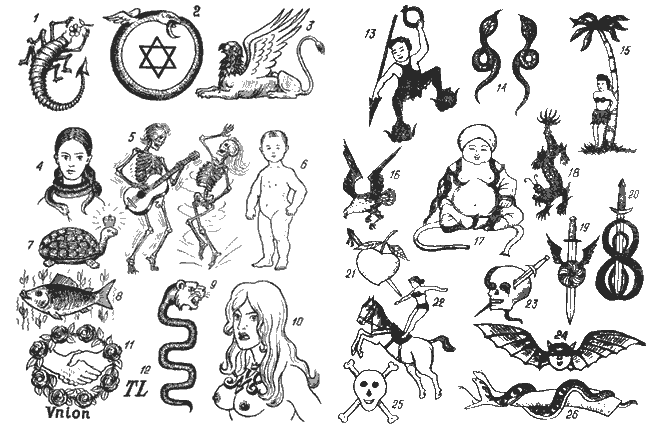 1. Скорпион и цветок - символ любви, сладости, долгой супружеской жизни; "остерегайся - я враг тебе" - более поздняя трактовка (Индия). 2. Замкнутый круг из крылатой змеи, в центре шестиконечная звезда - кастовость, вечность, непрерывность (Израиль). 3. Грифон (голова орла, тело льва) - "храню тайну вечно" (Иран). 4. Змея, обвившаяся вокруг шеи одного или нескольких человек,- олицетворение зла, "Ирод - убийца невинных" (восточная татуировка). 5. Пляшущие с гитарой скелеты - "презрение к смерти" (Мексика). 6. Ребенок - "жизненная сила", "продолжение рода" (восточная татуировка). 7. Черепаха с короной - символ долголетия, спокойствия (Корея). 8. Карп - "вестник удачи", "чистота души" (Корея). 9. Змея с головой льва - "ловкость, сила, удачливость" (Южная Америка). 10. Голова женщины с амулетом - "я отомщу" (Испания). 11. Пожатие рук в венке из цветов, в центре надпись на латыни: "Союз" - древняя татуировка воров Южной Франции. 12. Латинские буквы "Т" и "L" - символ воров (Германия). 13-26. Татуировки тайного общества "Триады" в Сингапуре