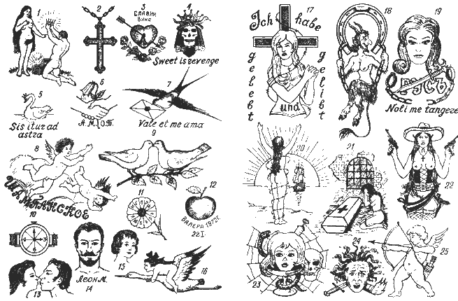 1. Обнаженные фигуры мужчины и женщины, ларец с драгоценностями, мужчина преподносит женщине корону - "было все, получила неволю", "закон обойду - он не для меня". 2. Крест треф на цепочке - символ воровок. 3. Сердце, пробитое стрелой, капли крови и виньетка из роз - "память о первой любви", "за любимого готова на все". Капли крови - зарождение нового. 4. Череп, обвитый змеей и увенчанный короной, в костяшках рук сердце - "любовь погубила свекровь", "посадила в тюрьму свекровь". 5. Лебедь с короной на голове - "была невинной", "была свободной". Иногда под татуировкой дата судимости. 6. Рукопожатие, цветок, колокольчик, инициалы - "отсидели с подругой срок звонком". 7. Ласточка с конвертом в клюве - символ амнистии, снижения срока лишения свободы. (Все птицы, кроме хищных,- вера в светлое будущее.) 8. Ангелы - "надежда на что-то". Падающий ангел - крушение надежды. 9. Целующиеся голуби - символ любви. 10. Часы - "отсидела срок звонком". 11. Цветок ромашка - воровская любовь (групповая). 12. Яблоко искушения - "потеря невинности", "впервые приняла наркотик", "впервые выпила алкогольный напиток". Обычно проставляется дата. 13. Целующиеся мужчина и женщина - "память о любимом". 14. Голова мужчины - портрет любимого, исполненный с фотографии. 15. Детская головка - "память о сиротке", "память об оставленном ребенке", "ребенок загублен абортом". 16. Девочка, сидящая на летящем аисте,- символ матери-одиночки. 17. Женщина, обвитая проволокой на фоне креста,- "невинно осужденная", "мой рок". (Воровская татуировка.) 18. Сатана, раскачивающийся на цепи, подкова - "было счастье, да сатана унес". 19. Голова женщины, кинжал, кандалы, надпись "Русь" - "отбывала наказание на чужбине" (вне России). 20. Женщина, обвитая колючей проволокой, на фоне солнца и парусника - надежда на светлое будущее (вода - очищение), "вспоминая волю, помню о родителях" (солнце - отец). 21. Скорбящая у гроба женщина - "память о родных, умерших в заключении", "мама, спи и жди меня". 22. Девушка с двумя револьверами в руках - женская "отрицала" (молодежная татуировка), "я - бандитка", "закону воров не изменю". 23. Женская головка, чаша, шприц, паутина - татуировка наркоманок. 24. Голова медузы Горгоны, меч, горящий факел - символ, отвращающий опасность, "за зло отомщу". 25. Амур, стреляющий из лука: а) "неверного накажу изменой"; 6) "верю в свою любовь"; в) на животе - была судима по ст. 115 УК РСФСР.